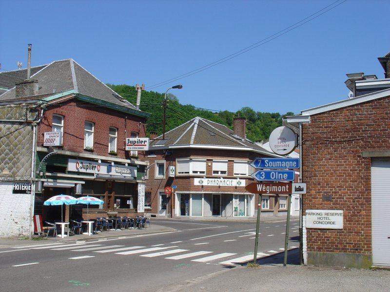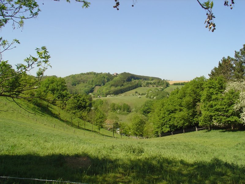 In Nessonvaux zelf is het restaurant zowaar open en drinken we eerst een kop koffie. Het is inmiddels bijna lunchtijd en we plakken er daarom ook maar een portie frites aan vast. Heerlijk in de buitenlucht maar wel onder een parasol want het is al behoorlijk warm geworden. Terwijl wij de heuvel op zeulen dartelen 3 jonge meiden ook met volle bepakking ons tegengesteld voorbij. We lopen even een stukje fier om zodra de dames uit beeld zijn weer verder te strompelen.