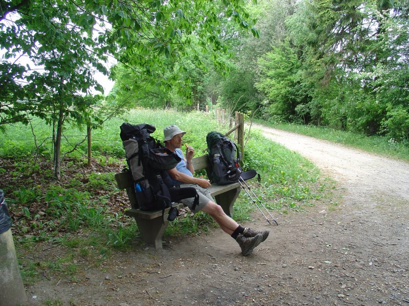 De kwalen van de vorige dag verdwijnen langzaam tijdens het lopen. In totaal staan er in deze lage Ardennen-etappe 3 colletjes op het programma, die dit keer zonder veel problemen worden genomen. We lopen door gortdroge bossen. Het is al zo lang droog dat het goed voorstelbaar is dat er elk moment een bosbrand kan uitbreken. Twee dagen terug zagen we vanuit de bus in Luik een grote rookwolk hangen, die achteraf een enorme bosbrand markeerde. Goed nieuws voor de Belgen, maar helaas voor ons: er is regen opkomst!