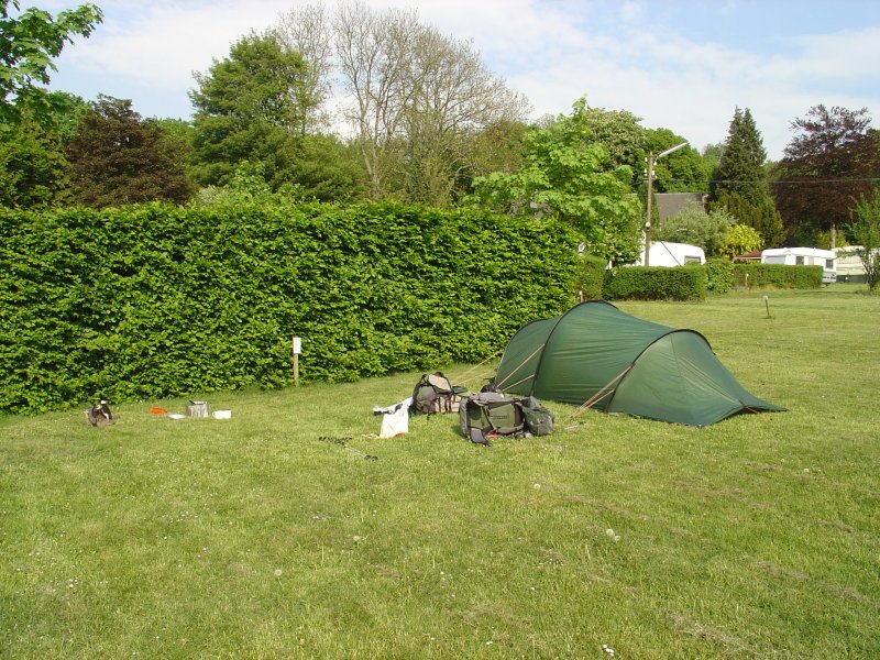 De tent is snel opgezet en we bereiden (de zojuist in Spa gekochte) soep op de benzinebrander. Het weer is nog prima en de krachten zijn snel weer terug, dus we zien het nog wel zitten om even af te dalen naar Spa. We nemen een terrasje aan de drukke hoofdstraat en kijken een tijdlang naar alles wat beweegt. Eenmaal weer terug op de camping genieten we zittend op een geleend bankje van de warme maaltijd. Terwijl we ons douchen worden de batterijen van de mobiele telefoon en het fototoestel weer opgeladen. De zon staat nog vlak boven de horizon als we nog een abdijbiertje (Maredsous) als afzakkertje nemen.