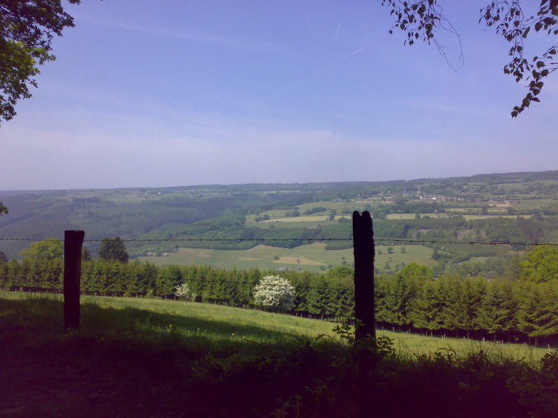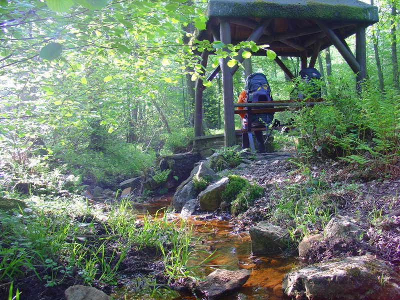 Aan de kleur van het water is al te zien dat er erg veel ijzerachtig iets in moet zitten. Ik vul mijn fles met het kostelijke Spa-water. Het is echter een heftig drankje en het staat inderdaad stijf van de mineralen. Toch drink ik het grootste deel onderweg op, misschien werkt het wel net als de toverdrank van Asterix. We worden ingehaald door een Nederlands echtpaar dat met een dagrugzak van hotel naar hotel sprint. Als een speer schieten ze ons voorbij en we zien hen die dag ook niet weer terug.