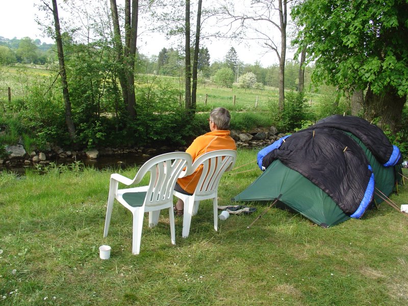 Even later stapt een Nederlander op ons af en dat blijkt de zaakwaarnemer te zijn, een aardige wat oudere man die ons heel vriendelijk helpt. We krijgen 2 muntjes van hem voor het douchen en ook bezorgd hij ongevraagd 2 van zijn eigen stoelen zodat we lekker kunnen zitten. We mogen zelf een mooi plekje uitzoeken en even later staan we met de tent aan het water. Eten en drinken hebben we gisteren al in Spa gekocht zodat we eigenlijk niet meer terug hoeven naar Stavelot. We blijven daarom ook op de camping. s'Avonds maken we nog even een ommetje naar de Amblève. De lucht begint verder te betrekken. Morgen in de regen?