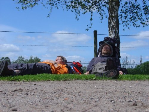 We stoppen even voor een middagdutje in de nu warme voorjaarszon. Dit gaan we vaker doen, we staan toch niet op tijd en weten ook niet waar we ’s avonds terecht zullen komen. Het maakt niet uit! We voelen ons steeds meer een stel zwervers.