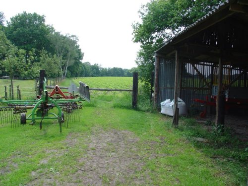 Het pad loopt meestal ruim om boerderijen heen, maar bij het gehucht Linde lijkt het pad dwars door een boerderij heen te lopen. We lopen recht op de voordeur af. We aarzelen en gelijk slaat de boer aan. We hadden de hond verwacht, maar van diverse kanten worden we aangespoord om toch maar door te lopen en over het erf achter de boerderij het pad weer te vervolgen. Als we om kijken staan er inderdaad piepkleine rood-witte streepjes op een paal.