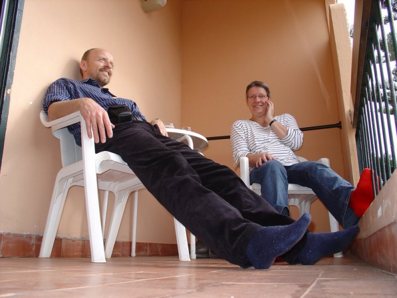 zonovergoten balkon wordt de hand geslagen aan een glaasje Madeira.