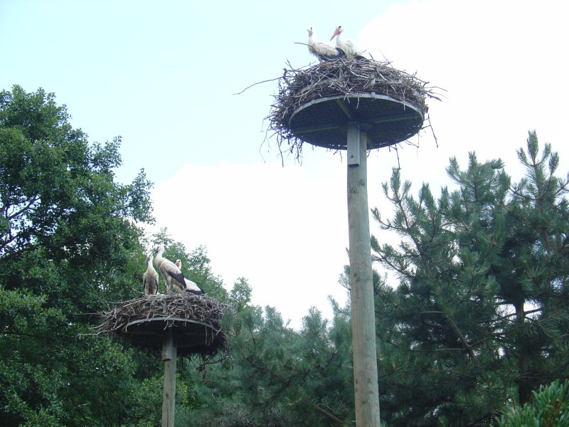 Niet alleen op de geijkte palen, maar ook in boomtoppen en op daken. Het geklepper dat ze om onduidelijke reden met de snavels maken gaat de hele dag door. Gelukkig slapen ze 's nachts zelf ook. Het ooievaarpark zelf stelt niet veel voor maar het aantal ooievaars is enorm. Dertig, veertig, het zijn er veel.
