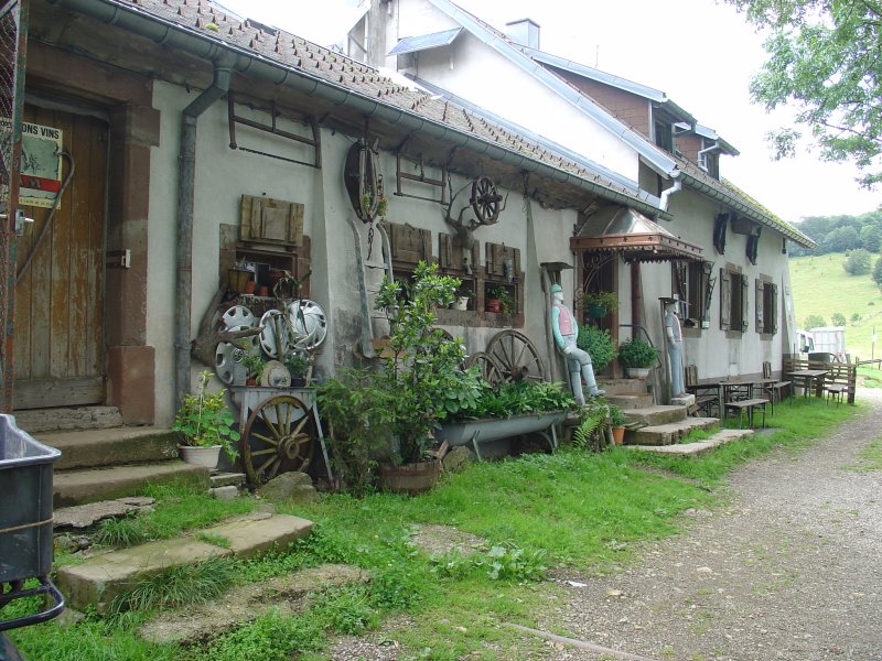 In een "Salon du The" nemen we uitgebreid koffie met broodjes. Buiten regent het maar door en met de poncho's aan beginnen we aan de beklimming van de Col du Hundsruecken. We zijn blij dat we weer lopen, niets kan ons meer tegenhouden. Na een paar honderd meter houdt het op met regenen en even later kunnen de poncho's ook weer af.We stijgen in 1 ruk door van 343 naar 1180 meter hoogte. Hoe hoger we komen hoe fraaier de uitzichten weer worden. Hier doen we het voor! Vlak na de "Rochers dits Vogelsteine" komen we bij ferme-auberge Belacker in de middle of nowhere. Er staan een paar landrovers, maar verder is er niemand te zien.