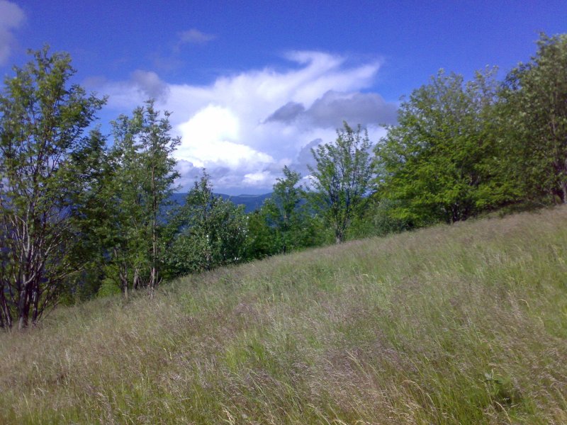 Verder gaat het weer. We blijven nu de rest van de dag boven de 1000 meter. Op afstand zien we enkele buien maar tot het eindpunt van vandaag blijft het droog. Op het kruispunt "Col des Perches" nemen we een andere route, de GR-531 die ons langs een stijl en soms glad paadje naar Rouge Gazon brengt.Hier staat een vrij groot hotel met wat bijgebouwtjes. We lopen er eerst maar eens omheen om te kijken of er alternatieven zijn. Wildkamperen behoort tot de mogelijkheden, maar het weer begint nu ook zichtbaar te verslechteren.