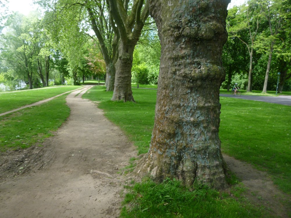 Na het oversteken van de Kennedybrug, komen we op de oostelijke Rijnoever uit op een brede boulevard, waar leilindes voor een beetje schaduw kunnen zorgen. Het is best al warm geworden, maar regen of onweer lijkt er niet aan te komen. Vlak voor de volgende brug buigen we af van de rivier. Het is een hele klim naar het zogeheten Foveaux-Hauschen, een klein stenen huisje midden in het bos. We pauzeren er even voor een broodje.