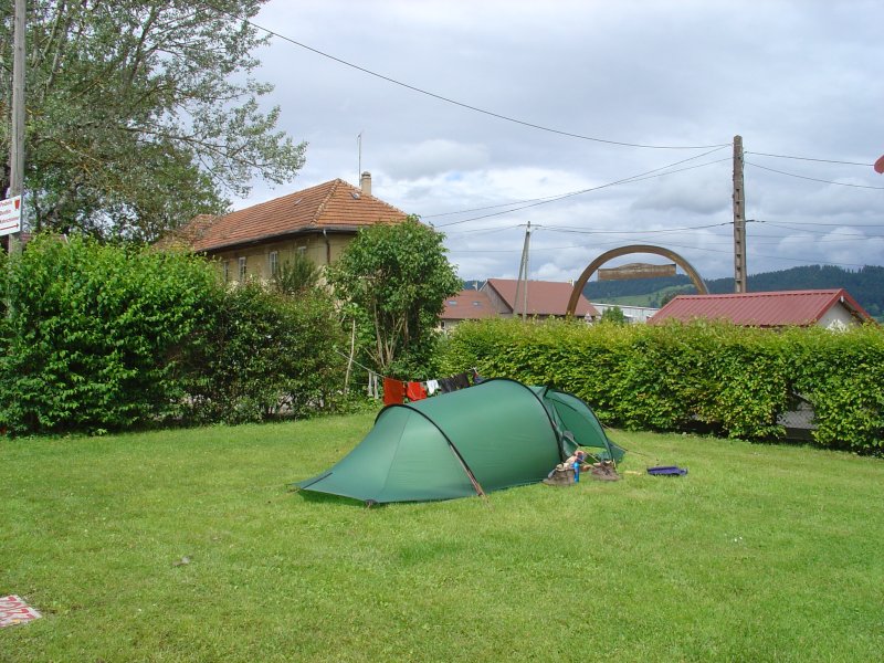 De volgende dag vinden we op de keukentafel een papiertje waarop staat hoeveel we verschuldigd zijn. Na de donatie op het schoteltje gelegd te hebben nemen we afscheid van Leon en Hilly. Nu zijn de rollen omgedraaid en mogen zij verder! We moeten voor een treinverbinding van de GR-route af naar het volgende dorp Morteau. De bussen rijden hier zo onregelmatig dat lopen nog het snelste gaat. We navigeren op de kaart en nemen daarbij nog een heuveltje. De poncho's moeten weer aan, maar kunnen weer af bij het bereiken van Morteau. Op de camping staan we op een mooi plekje en hoeven ons nu alleen nog maar bezig te houden met de terugreis.