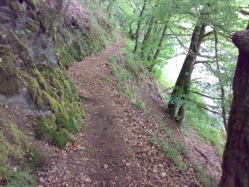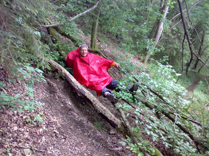 Het pad langs de Our is eigenlijk wat we er ook van hadden verwacht. De rivier onder ons en links en rechts steile wanden. Aanvankelijk lijkt het een eitje, maar alras begint het toch flink te stijgen en te dalen. In Dasburg kunnen we de benzinetankjes allebei weer vullen. Daar kunnen we weer 2 weken op koken. Vlak naast de pomp zakken we neer op een terrasje en bestellen koffie bij een soort Bud Spencer figuur. We voelen ons een beetje bekocht want hij heeft er niet bij gezegd dat voor het terras een dubbel tarief gold. En dat dat terras nu zo iets bijzonders was ...