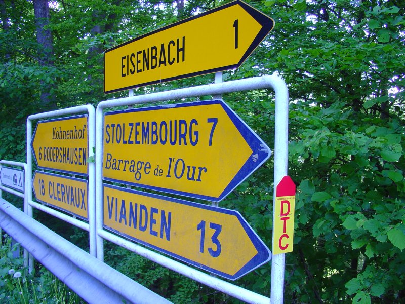 7 uur, opstaan. Om 8.45 uur verlaten we de camping beladen met broodjes. De nog warme croissantjes gaan direct naar binnen, de rest is voor onderweg. Vlak buiten Ouren komen we op het Drielandenpunt, waar België, Duitsland en Luxemburg bij elkaar komen. Het monument voor Europese eenheid dat erbij hoort maakt op ons niet zo veel indruk. Wel zien we dat voor Nederland Luns en Linthorst Homan hebben getekend. Grote namen uit een recent verleden. Tijd is vergankelijk, zo ook de mens. We beseffen eens te meer dat we de dagen moeten plukken nu het nog kan. We bereiken Luxemburg en gaan van rood-wit over op gele bollen. Later worden het gele rechthoeken en gele driehoeken, maar eerst dus gele bollen.