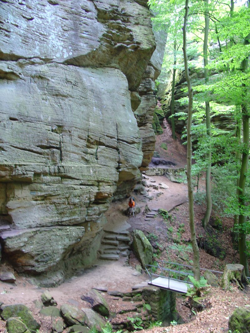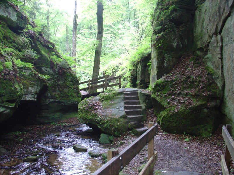 Door nauwe gangetjes en zigzagpaden lopen we tussen hoge rotswanden naar de Teufelsschlucht. De wanden komen soms zo dicht bij elkaar dat we er maar ternauwernood door heen passen en de rugzakken langs de stenen schuren. Het spektakel eindigt in Echternach, waar we bij het begin van het dorp een fraaie camping vinden. We hebben weer een heel veld voor ons zelf en de tent staat nauwelijks of er barst een hevige bui los.Later bezoeken wij het dorpje Echternach zelf met zijn mooie centrum en oude gebouwen. We vinden dat we vandaag wel een etentje verdiend hebben en trakteren ons zelf op een pizza. Soms zit het mee...