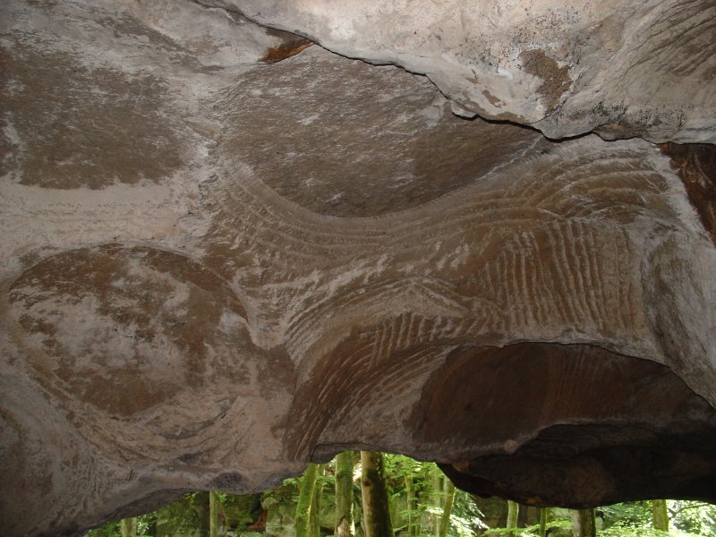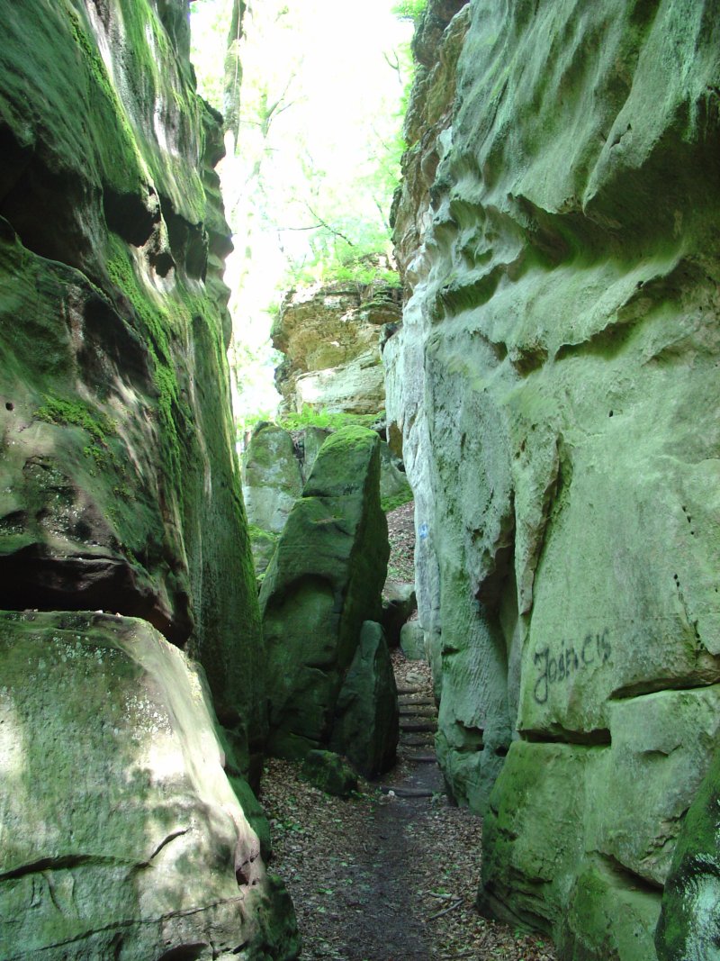 Na de rustpauze lopen we het dal van de Aesbech in. Eerst passeren we enkele door mensen uitgehakte grotten (Houllay is de grootste, zie foto). Fraai zijn in het plafond de plekken te zien waar men in vroegere dagen molenstenen wegkapte. We lopen verder stroomafwaarts en bereiken al snel de rotsformatie met de naam "Perekop". We laten dit toeristische uitstapje echter links liggen. Met de kinderen zijn we hier al eens in en op geweest.