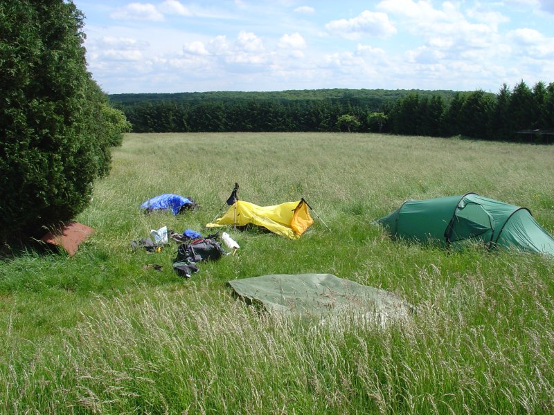 Na Berdorf stoppen we eerst bij een weiland om alle spullen te laten drogen. Het waait lekker en de zon krijgt alles in drie kwartier weer droog. Het geheel ziet er uit als een explosie, maar zo ziet het er steeds uit als wij ergens neerstrijken. Het wordt even spannend als er een boer aankomt rijden met zijn trekker. Gelukkig begint hij te maaien in het aangrenzende perceel.