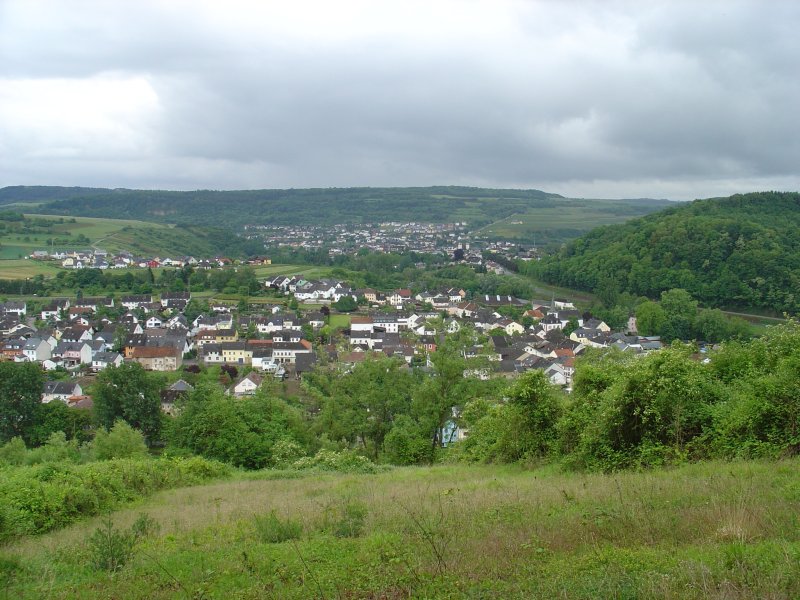 In Moersdorf proberen we om koffie "met iets erbij" te krijgen maar daarin moet de eigenaar ons teleurstellen. Dus alleen maar koffie. Waarschijnlijk is de teleurstelling op het gezicht af te lezen, want we krijgen een grote hand met snoepjes mee voor onderweg.Na Moersdorf gaat het pad een eind de bossen in. Niet spectaculair maar wel erg stil, er is geen kip te zien. Als wij uit het bos komen zien we de autobaan Luxemburg-Trier op hoge pijlers door het dal heen lopen.