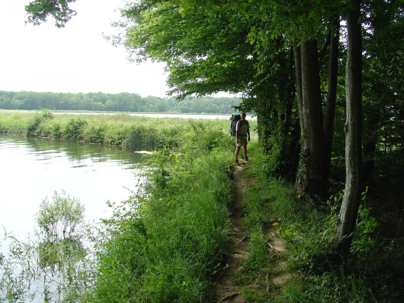 Het wordt al weer een warme dag, eigenlijk wel jammer dat we zo laat beginnen met lopen. Het is hier vrij plat, daardoor valt de inspanning uiteindelijk toch wel mee. David heeft ons bij het verlaten van het kasteel spontaan een lunch in handen gedrukt. We naderen een groot merengebied en als de eerste uitlopers ervan in beeld komen ploffen we neer op een bankje voor de broodjes. De rest van de dag lopen we langs meren en kanalen. Overal langs de kant zitten er mensen te vissen.