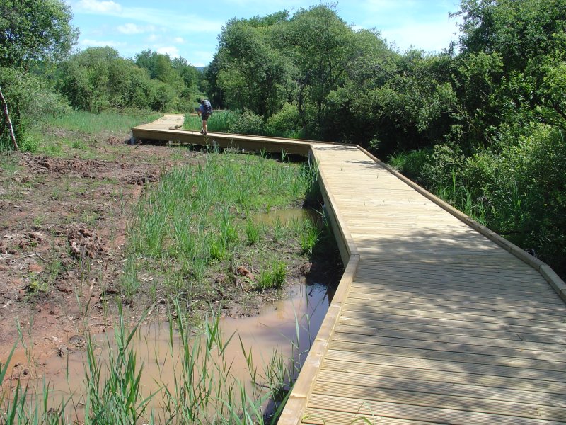 We verlaten Gyromagny en lopen via bospaden tot vlak voor Evette waar we doodlopen tegen een groot hek. We besluiten een alternatief pad te nemen en dat is weliswaar 1 kilometer om, maar zeker de moeite waard. De route loopt o.a. over lange houten vlonders dwars door een natuurgebied en uiteindelijk komen we op ongeveer dezelfde plek uit als wanneer we rechtdoor waren gelopen. Er blijkt een groot jaarlijks popfestival te zijn, maar we vinden het eigenlijk wel schandalig dat er geen enkele rekening gehouden wordt met langeafstandswandelaars. Nu kan ik een beetje kaart lezen, dus het komt wel goed, maar toch...