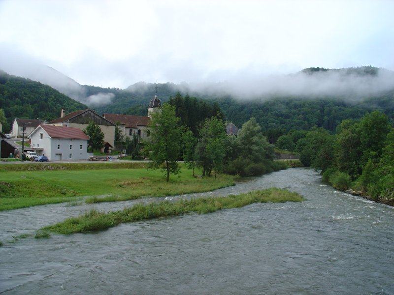 De camping "La Forest" is netjes en niet duur. Toevallig gaat net het kantoortje open en leidt de madame ons naar het trekkersveld dat we alleen niet gevonden zouden hebben. Vlak naast een waterval met onder ons de Doubs. Op enige afstand staat een Gite waar ook activiteit is. Mogelijkheden genoeg dus, maar wij zetten de tent neer op een verder leeg trekkersveld. We krijgen op verzoek 2 stoeltjes mee, dus we hebben alle luxe die we nodig hebben voor het kamperen. De waterval en de koeienbellen aan de andere kant van de rivier maken het niet moeilijk om in slaap te komen (filmpje).
