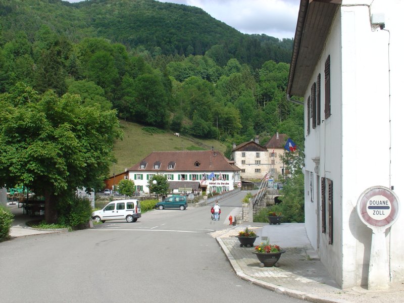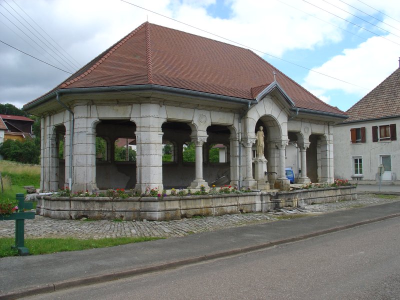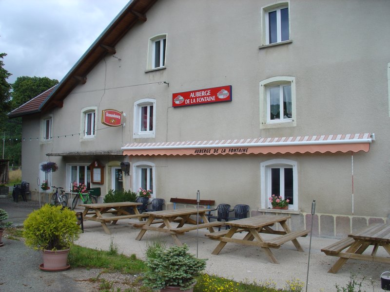 Er komt geen bakker in beeld dus we eten als ontbijt onze meegenomen pannenkoekjes met chocolade. We verlaten de Doubs en klimmen geleidelijk omhoog naar Courtfontaine. We hebben al heel wat lavatoirs gezien maar deze slaat alles. Als fontein/bron wasplaats is het gebouwtje heel functioneel, maar ook architectonisch is kostte nog moeite gespaard om er een blikvanger van te maken. We kijken rond of we ergens koffie kunnen krijgen. Het nadeel is nu dat dit soort zaken niet in het boekje staan beschreven. Iets verder zien we een restaurant en dat is ook nog eens open!