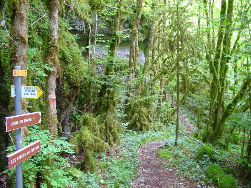 Voor we vertrekken maak ik nog wat foto's op deze toch wel unieke plek. We lopen weer langs de Doubs en ondanks dat verkeerd lopen vrijwel onmogelijk is met de steile rotswand aan de ene kant en de rivier aan de andere kant zijn er toch opvallend veel rood/witte markeringen geplaatst. Het IQ van de gemiddelde wandelaar wordt hier blijkbaar niet erg hoog ingeschat.De alom aanwezige mosbekleding op soms elke boom en tak ziet er sprookjesachtig uit. Als het wit was geweest hadden we in een kerstplaatje gelopen. Nu is het een groen Kerstplaatje.