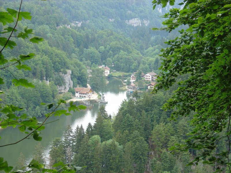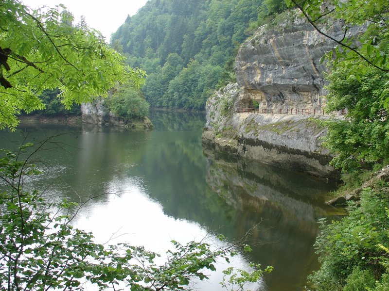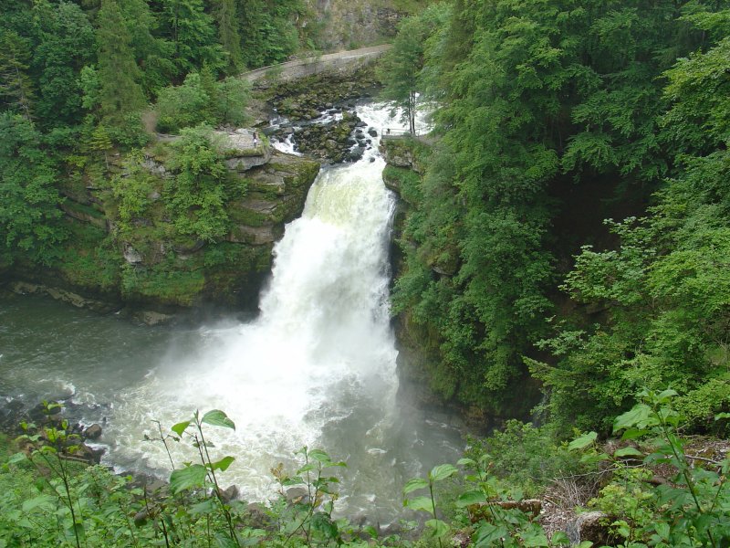 Vlak na de Châtelot dam begint het ineens te onweren. Tussen het eerste gerommel en de bui zelf zit niet meer dan 5 minuten. En dan is het nog de vraag uit welke hoek het komt, want de echo's komen van alle kanten. Het is ook zo weer voorbij. We lopen beschut tussen de bomen dus veel kan er niet gebeuren, althans dat vind ik. Even verder lopen we langs de waterval "Saut du Doubs". Een toeristische trekpleister van de eerste orde, zeker op een zondag. De waterval zelf heeft een hoogte van 27 meter en al het water van de Doubs perst zich door dit gat naar beneden (filmpje).