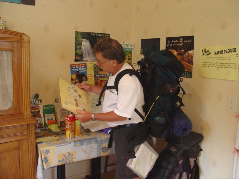 Hilly en Leon komen ook aangelopen. Met zijn vieren heb je nog een beetje een veilig gevoel. Zij zien kamperen hier echter niet zo erg zitten. Wij eigenlijk ook niet, maar wat zijn de alternatieven? We lopen weer naar beneden en ik sla aan het bellen. Na 3 telefoontjes word ik doorverwezen naar een Gite de Randonneurs ongeveer 100 meter vanaf de brug verder doorlopen en dan aan de linker kant. En zowaar daar staat inderdaad de beloofde Gite. De deur is open, maar er is geen mens te zien. We verkennen het gebouw, kiezen een eigen slaapzaal en nemen een heerlijke douche.