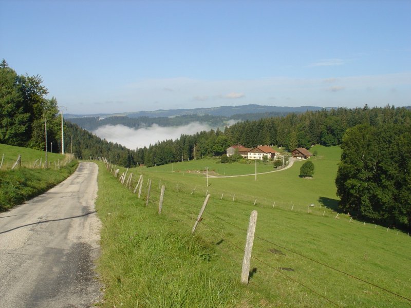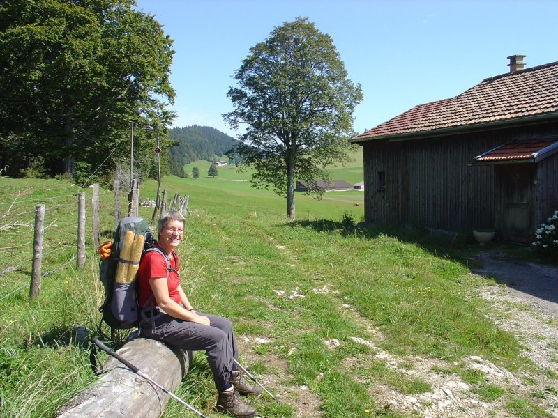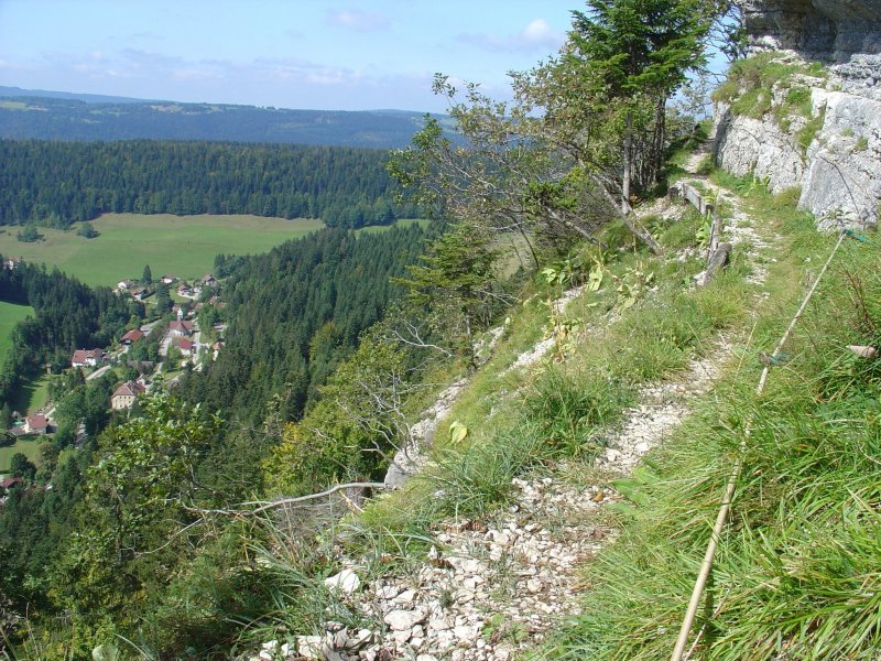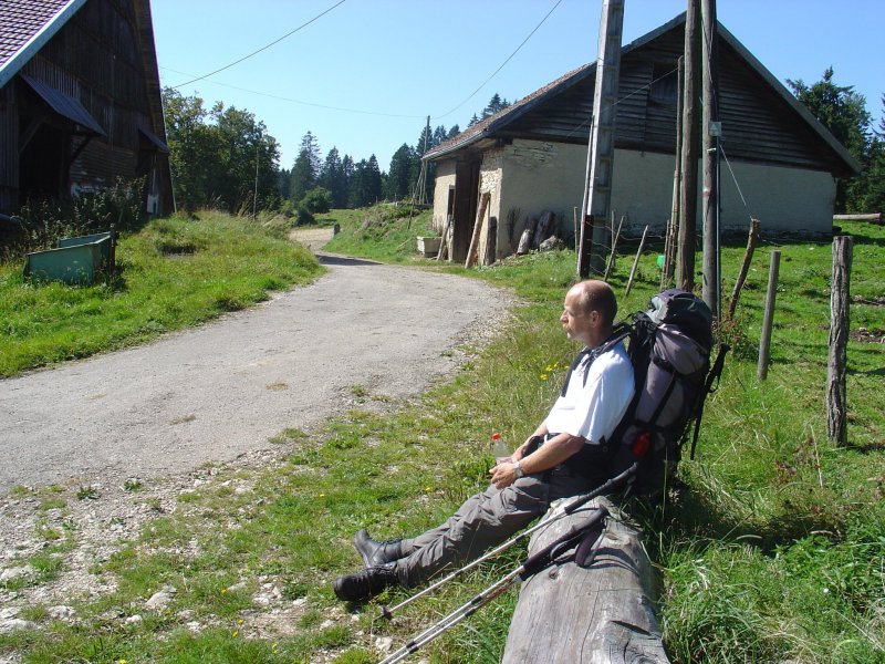 We hebben na 100 meter de GR-5 weer te pakken en stijgen de berg achter Villers-le-Lac omhoog. Naarmate we hoger komen breekt de bewolking. Op een gegeven moment lopen we boven de wolken en is de lucht strakblauw. Op 1160 meter hoogte bereiken we de Auberge "Sur la Roche". Daar hadden we dus ook kunnen overnachten. We lopen over een soort bergkam met verre uitzichten vooral richting het westen en noorden van de Jura. Het is heerlijk weer om te wandelen, de spierpijn blijft uit en dus kunnen we volop genieten.