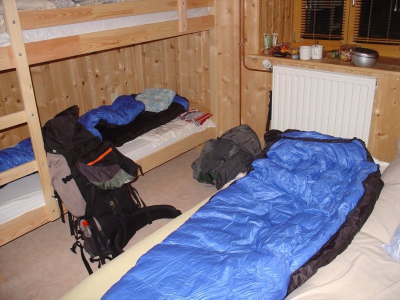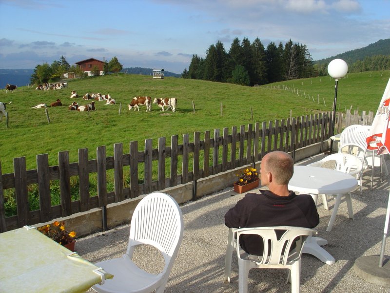 De Gite "Vieux Châtelleu " is juist vandaag gesloten, maar dat hadden we al gehoord van de franse wandelaars. Het eerst volgende alternatief is de Auberge/Gite d'Etappe "Des Cerneux". Het lijkt een goede keuze. Op een hoogte van 1020 meter zitten we heerlijk met een biertje op het terras achter de Gite en kijken uit over een zonovergoten Alpenlandschap. Na ons opgefrist te hebben dineren we in het inpandige restaurant. Terwijl buiten langzaam de avond begint te vallen eten we het lokale streekgerecht van Morteau: gerookte ham en worst. De eerste dag is perfect verlopen.