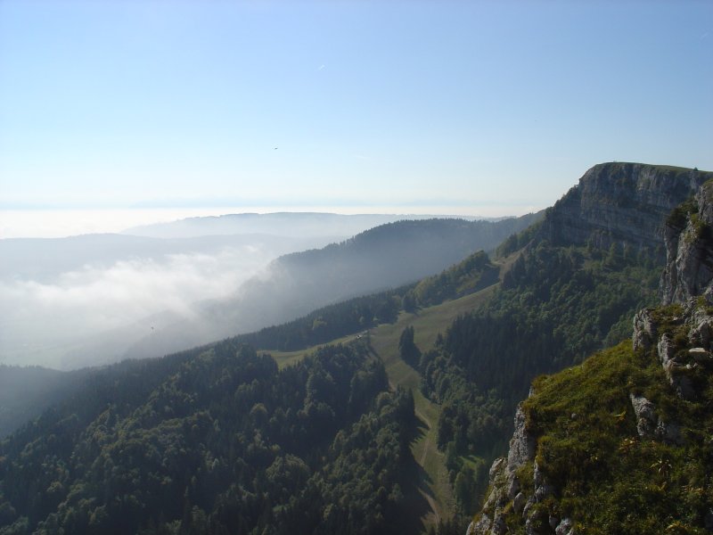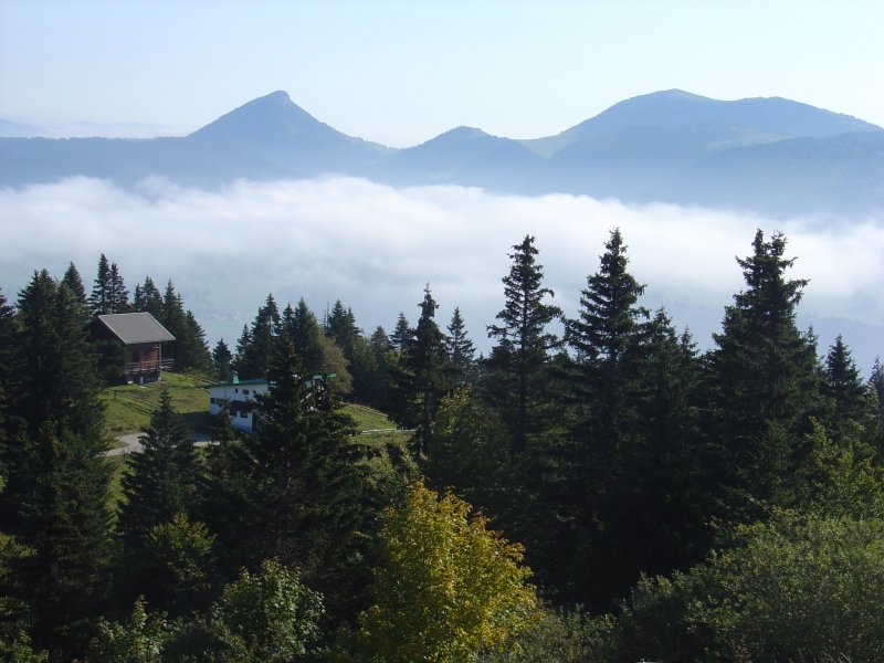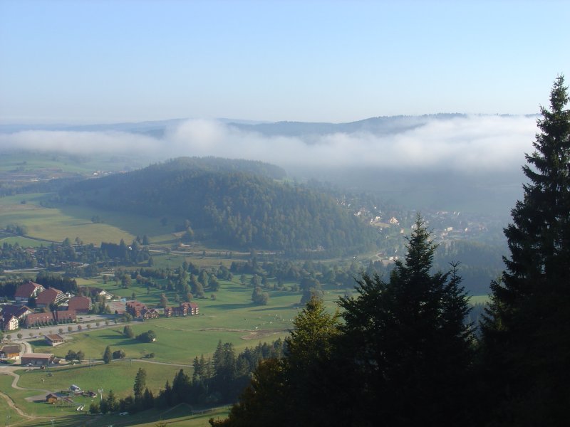 We hopen iets te kunnen drinken in restaurant "Petit Morond", maar er is geen sterveling te bekennen. We klimmen verder en bereiken de top van de Gormond op 1400 meter. Uitzicht alom. We zien de Zwitserse Jura boven mist en bewolking uitsteken. Overal kabelbanen en skipistes, nu maar hopen dat er deze winter ook sneeuw komt.