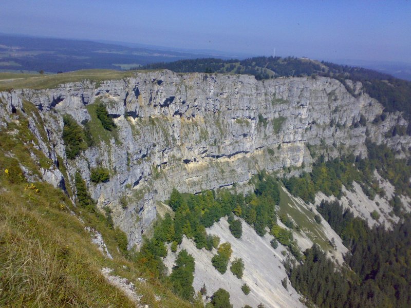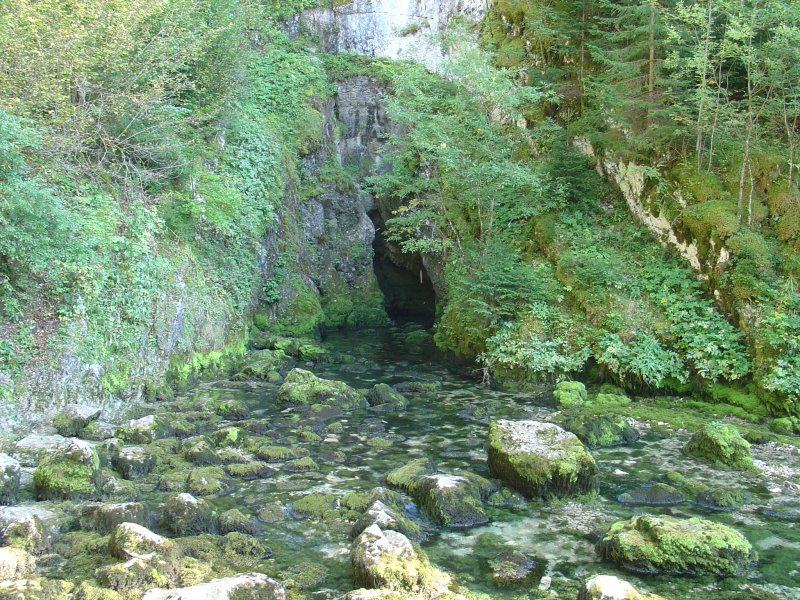 Na een half uur dalen we af tot Chalet "la Blonay" waar we ons laven aan een paar flesjes koude cola. Volgens het boekje moet er in Mouthe een camping zijn. We zien Mouthe ver voor ons in het dal liggen. Veel dichterbij, onder aan de berg waar we op staan, ligt iets dat op een camping lijkt. Met de verrekijker ontcijferen we de naam van een gebouw "Source du Doubs". Daar moeten we dus uit zien te komen. Even later bereiken we de bron van de Doubs. Merkwaardig om een rivier zomaar uit een berg te zien komen. Er ligt ongetwijfeld een heel labyrint van gangen en grotten binnen de berg, maar tot nu toe heeft niemand het in kaart kunnen brengen.