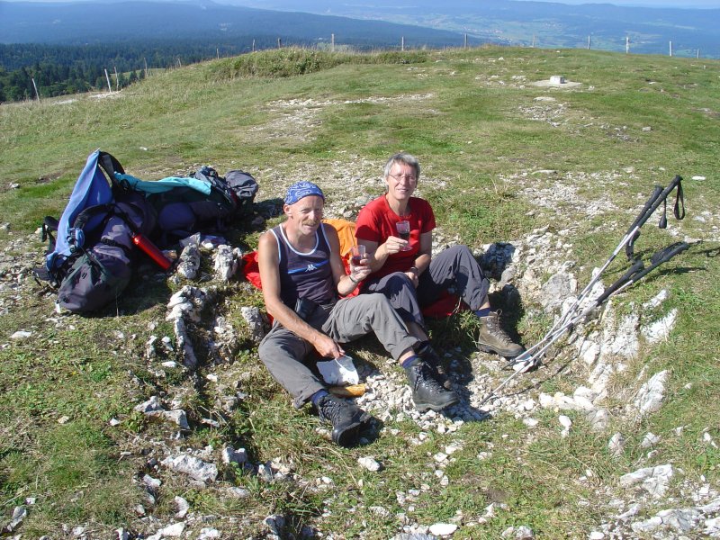 Theoretisch zouden we het meer van Geneve moeten kunnen zien, maar we kijken neer op een witte deken. Op de achtergrond zien we het Alpenmassief weliswaar enigszins in nevelen gehuld, maar we herkennen zonder veel moeite de Mont Blanc. We lopen weer verder dit keer langs een steile richel (filmpje). Op het hoogste punt van de Mont d'Or (1462 meter) nemen we stokbrood, kaas en een glaasje wijn en laten dit moment door een passant vereeuwigen. Het is niet alleen het hoogste punt van vandaag, maar van onze hele tocht vanaf Maastricht. Vanaf nu gaat het steeds verder omlaag tot aan het meer van Geneve.