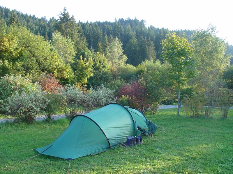 Wat we vanaf de berg gezien hebben is het restaurant van de camping. Helaas is het vandaag dicht, maar de buiten klussende eigenaar ziet dat we naar een biertje snakken, die wil hij wel even voor ons tappen. Als wandelaar met rugzak heb je soms een streepje voor. We vinden een mooi plekje voor de tent, hemelsbreed nog geen 300 meter van de Source du Doubs. Het sanitair heeft een cijfercode en zit op slot. Toevallig komt de eigenaresse van de camping even op het kantoor. De dame geeft ons de toegangscode van het sanitair zodat we ons toch nog kunnen douchen. Begeleid door een ondergaande zon lopen we naar Mouthe en eten een pizza in een ontzettend klein restaurantje. Als we later teruglopen is het donker. Er is geen verlichting maar met wat licht van de sterren en een zaklampje komen we weer bij de tent. Mouthe is de koudste plaats in Frankrijk. Het wordt er met gemak 30 graden onder nul, maar daar ziet het vannacht niet naar uit.