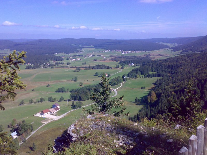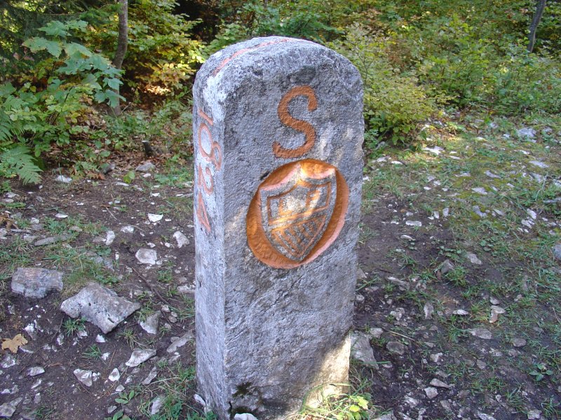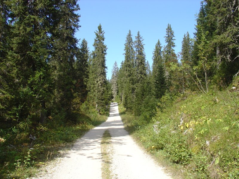 Ik maak veel foto's om later nog eens rustig na te kunnen genieten. Aanvankelijk loopt het pad nog langs de Zwitserse grens, waar we vele goed onderhouden grenspaaltjes tegen komen. Ina ziet vlak voor haar nog een steenbok het bos in vluchten. Dat aanblik is mij helaas niet gegund. Na enige tijd wijkt de GR-5 van de rotswand af richting een soort plateau waar we in een rap tempo onze kilometers kunnen maken. De bossen zijn hier enorm, haast eindeloos. Het is nu minder spectaculair, maar de kronkelende wegen en paden geven desalniettemin toch iedere keer weer een verrassend tafereeltje.