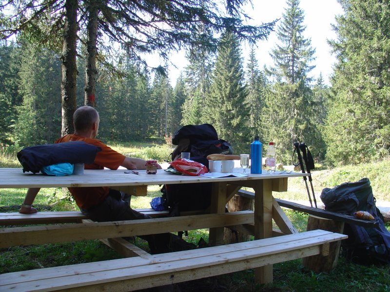 Ook vandaag is het ideaal weer om te wandelen. In de zon is het best wel warm, maar in de schaduw heerlijk koel met een zacht briesje. Op het moment dat we er aan denken om ergens langs de kant op een boomstam te gaan lunchen duikt er uit het middle of nowhere een picknicktafel op. De stevige fransman die er al zit wil gelijk weggaan, maar we kunnen hem nog even tegenhouden voor een kort gesprekje.